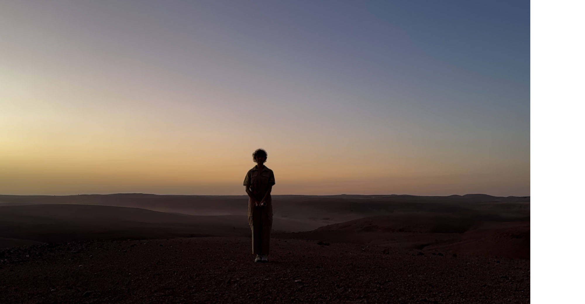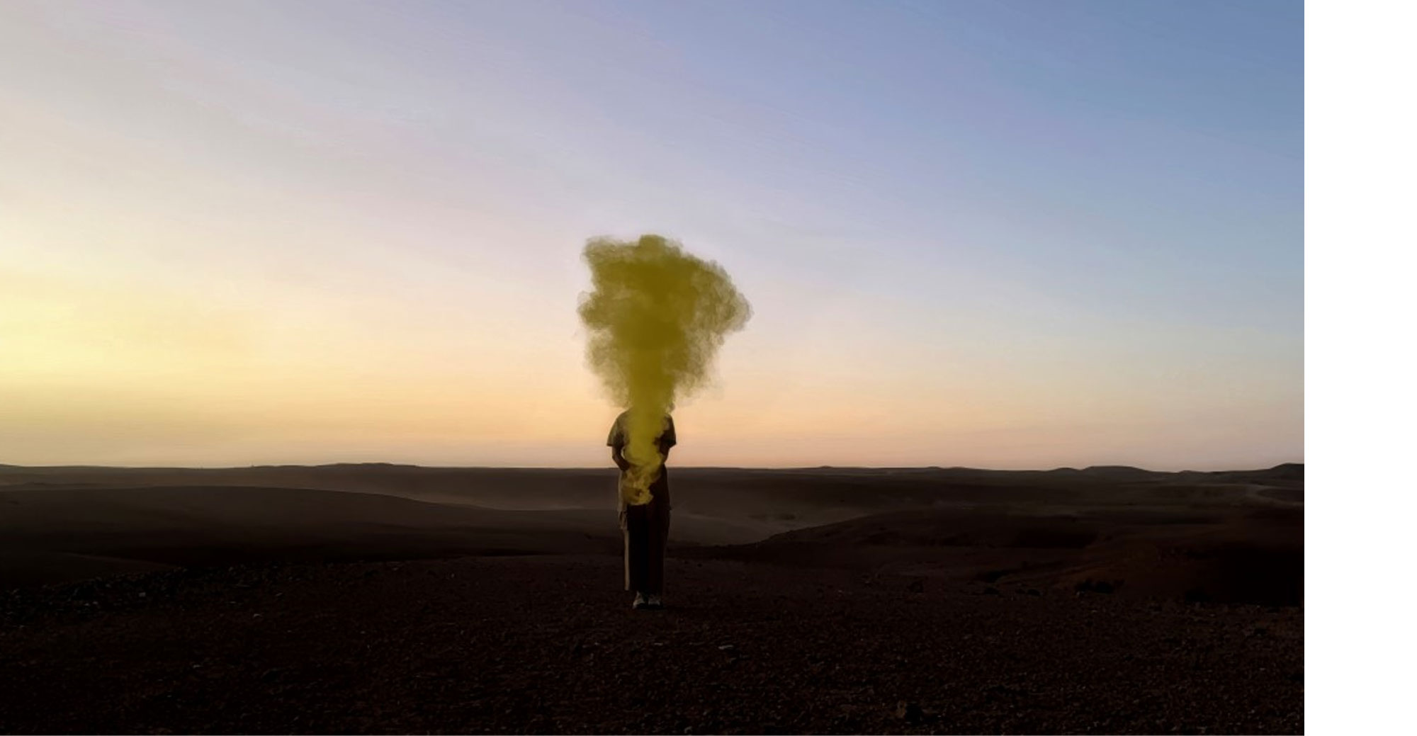 ((( Tessa Knapp sendet ein ephemeres Signal aus der Ferne einer kargen Landschaft. Die Silhouette einer Figur steht still im Abendlicht einer planetarisch wirkenden Umgebung und scheint zu warten. Aus ihrer Hand steigt in einer Eruption eine gelbe Farbwolke auf, verändert ihre Form und wird als Windzeichnung davon getragen. )))